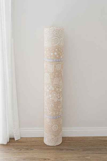 Ironically, this age old art brings modern life to the living room. Layers of hand drawn IVORY and soft walnut tones create a textured piled rug feel, camouflaging a baby play mat in order to compliment your home décor.