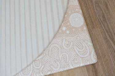 Our play mats are reversible giving you the flexibility of two completely different looks. On the reverse of this design is our Natural Stripes. The reverse of the Aztec ivory ROUND size is Geo Latte.