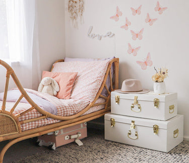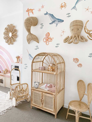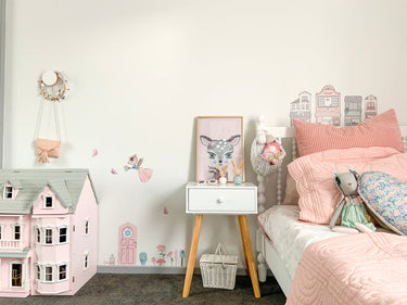 Our Toad Stool removable wall decals are varying in height from 20cm - 40cm. There are 4 in a pack and can be used to create a gorgeous little corner or play feature. Decals come packaged in our beautiful pink tubes with gold foil detailing.