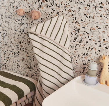 The mirror frame is handcrafted from paper clay - a mix of recycled paper pulp and clay powder. Air dried under the suns rays, the material takes on a solid sculptural form with a textured appearance. It is then hand painted with water based paint in olive green with pink stripes.